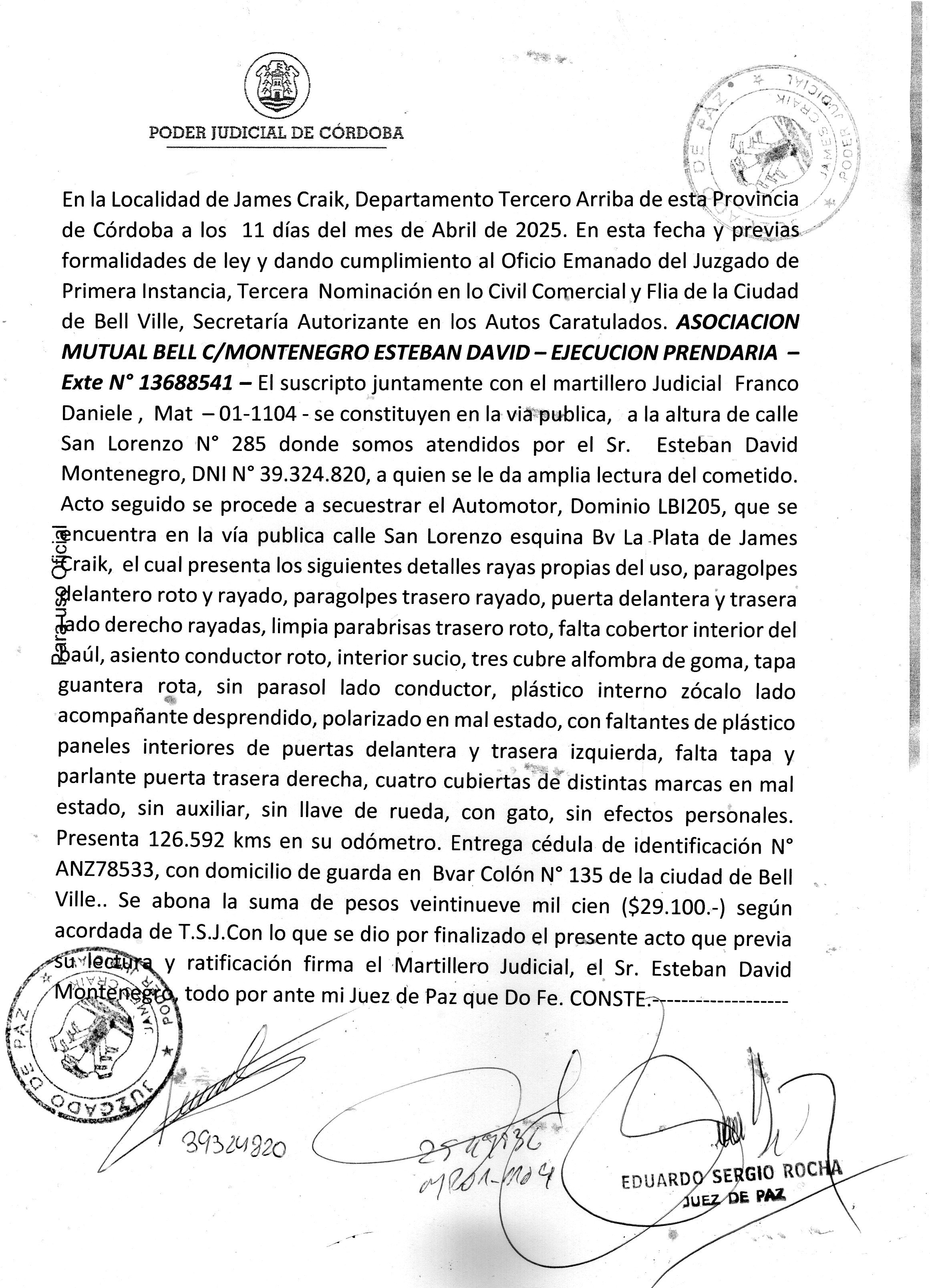 BELL VILLE, 26/02/2026. Atento lo solicitado y constancias de autos, y lo dispuesto por AR 167 SERIE B del 16/05/2024, sáquese a subasta a través del Portal de Subastas Judiciales Electrónicas, conforme AR 167 del 16/05/2024, con intervención del martillero designado Franco Andrés Daniele, M.P. 01-1104, un Automotor Dominio LBI205 que se describe como: RENAULT, tipo Sedan 5 puertas, modelo CLIO 5P AUTHENTIQUE 1.2 PACK, modelo año 2012, motor marca RENAULT N° D4FG728Q108134, chasis marca RENAULT N° 8A 1BB2U01CL178218, el que se subastará en las condiciones que da cuenta el oficio de secuestro incorporado a autos, el automotor se encuentra inscripto a nombre de la parte demandada Esteban David MONTENEGRO D.N.I. Nº 39.324.820.